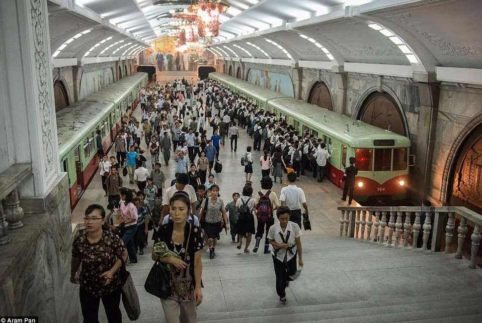 20. This is the Pyongyang subway with a bunch of people waiting to go to work or school.